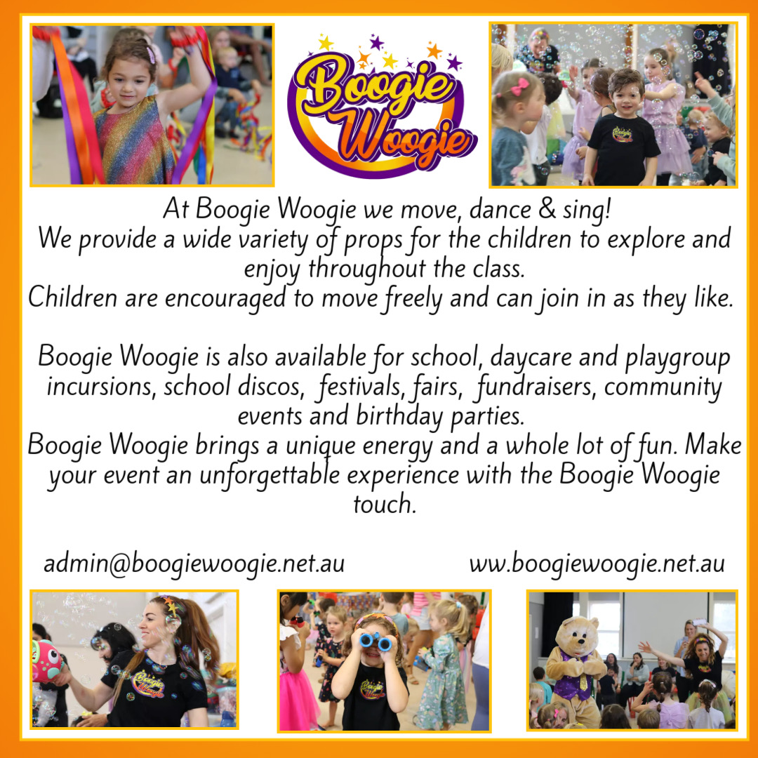 A Boogie Woogie session runs for approximately 45 -50 mins with non-stop dancing, singing, moving and fun. Every class is filled with a variety of props for the children to explore and enjoy.